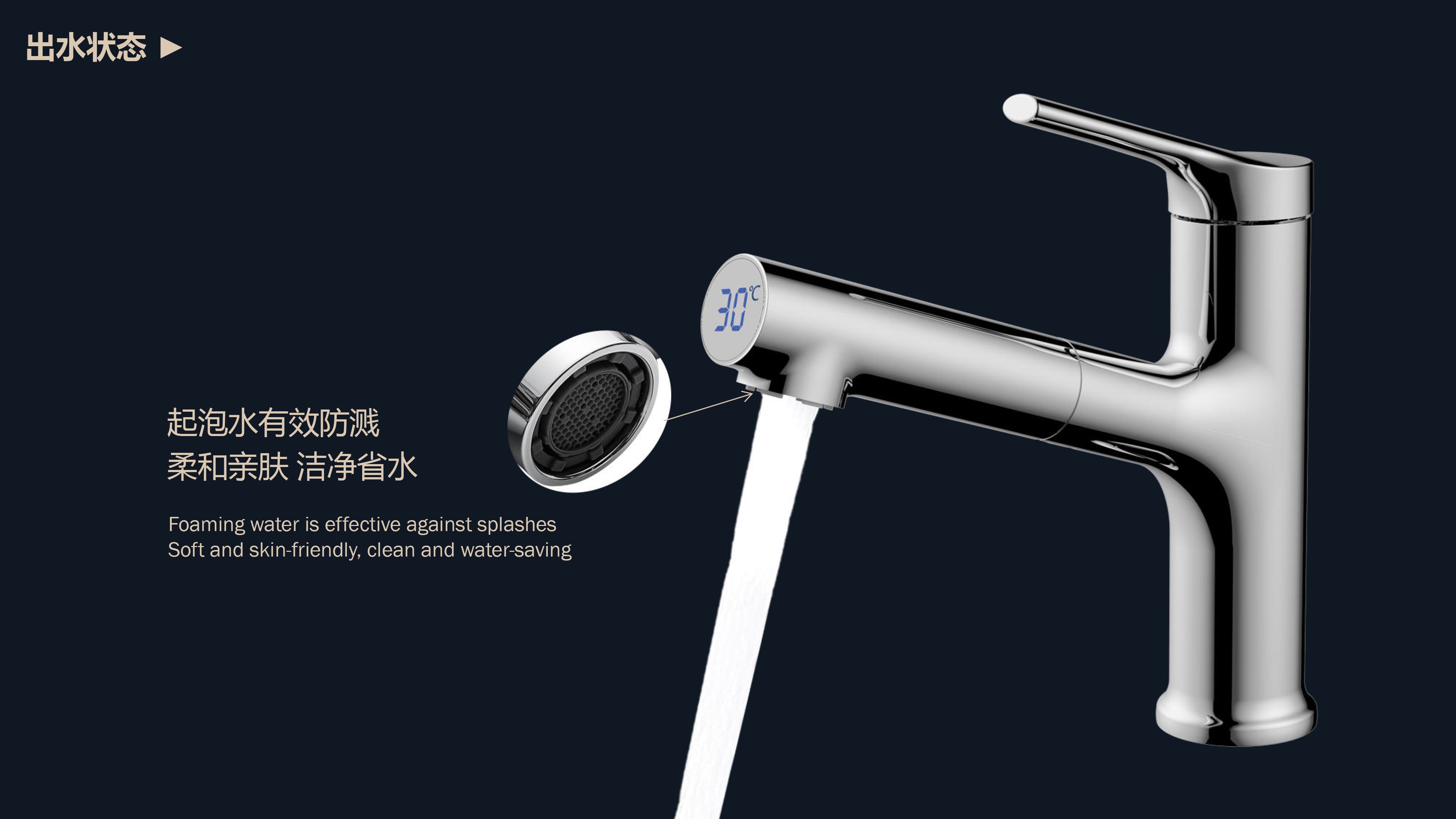 出水溫度實時看得見,解鎖龍頭舒適用法;抽拉范圍廣,360°全方位清洗;日常洗頭利器,龍頭抽拉出水輕松洗;氣泡水有效防濺,柔和親膚,潔凈省水;重力錘復(fù)位系統(tǒng),順暢伸縮,精準(zhǔn)回位