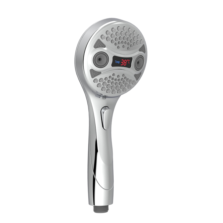 Three-function temperature display shower; Unique E.T. appearance design; TPR water outlet, gently remove scale; LED three-color water outlet, visible water temperature; Press the key to switch the three-gear mode to water outlet; Comfortable grip and anti-slip