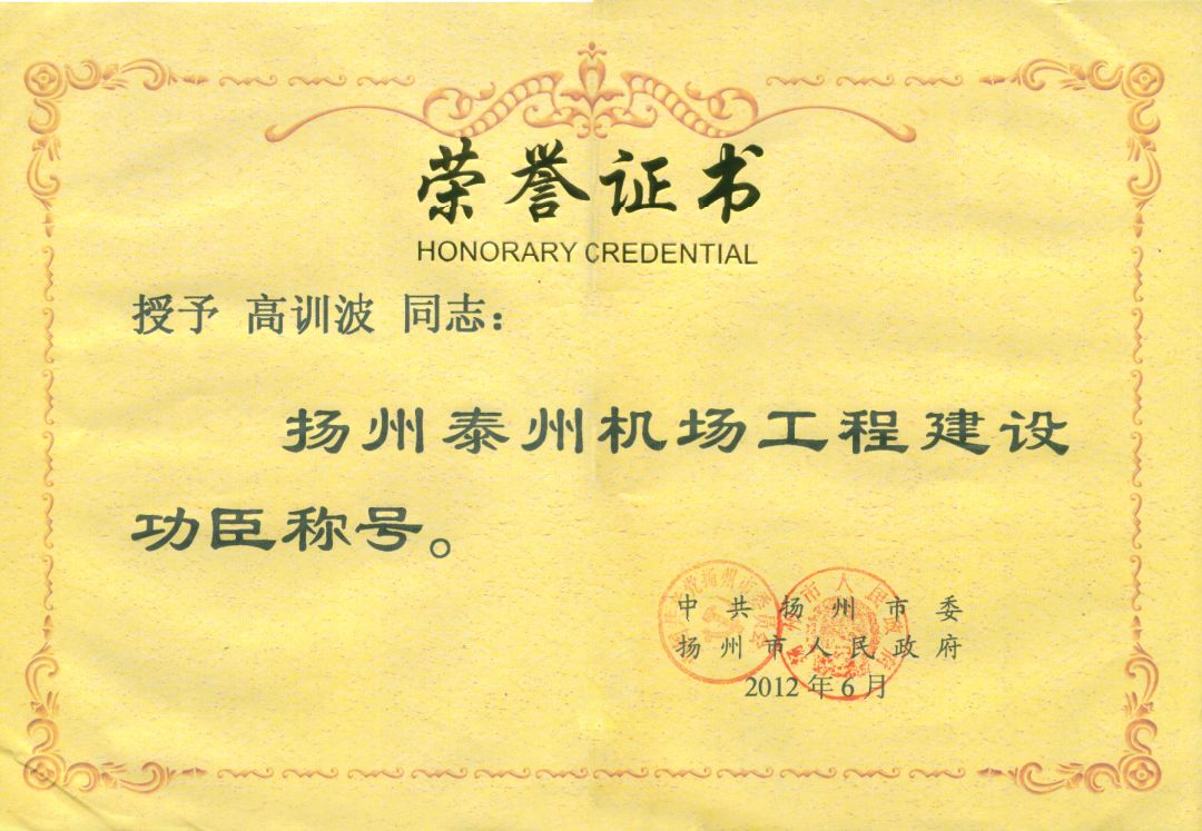 | 熱烈祝賀高訓(xùn)波同志喜獲“揚(yáng)州泰州機(jī)場(chǎng)建設(shè)功臣”榮譽(yù)稱號(hào) |